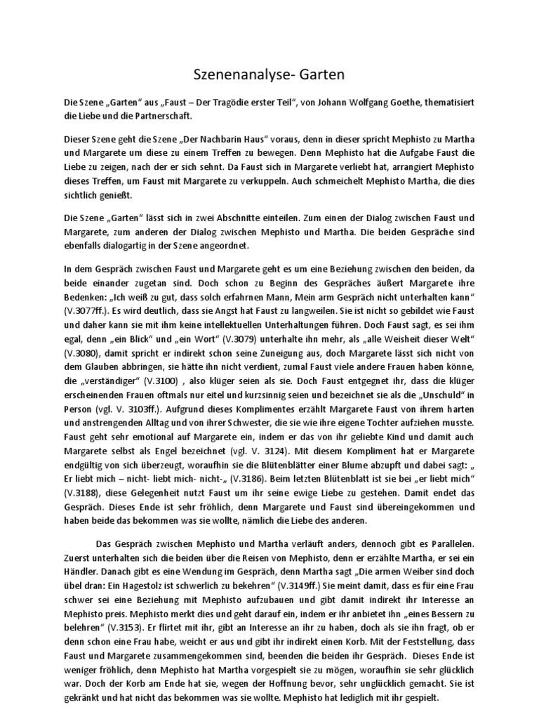 Beide paare reden nur unter sich nicht miteinander. Faust i marthens garten johann wolfgang von goethe. Die szene garten kann in sechs kleine abschnitte unterteilt werden welche die einzelnen gesprächssituationen abbilden.